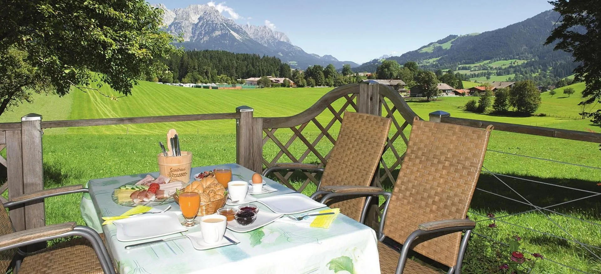 Die Gäste können das frisch gebackene Brot auf der Terrasse mit Blick auf die Berge genießen. Hier entlang zu Herta´s Bauernbrot-Rezept.
